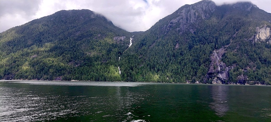 We motored into spectacularly beautiful 17-mile-long Kingcome Inlet under clearing skies, and, after some more time spent motoring, we were able to sail in a pleasant tailwind and gentle following seas for about an hour. We passed gargantuan granite cliffs and high, heavily wooded hills down which waterfalls of all descriptions crept, leapt, and somersaulted into the sea.