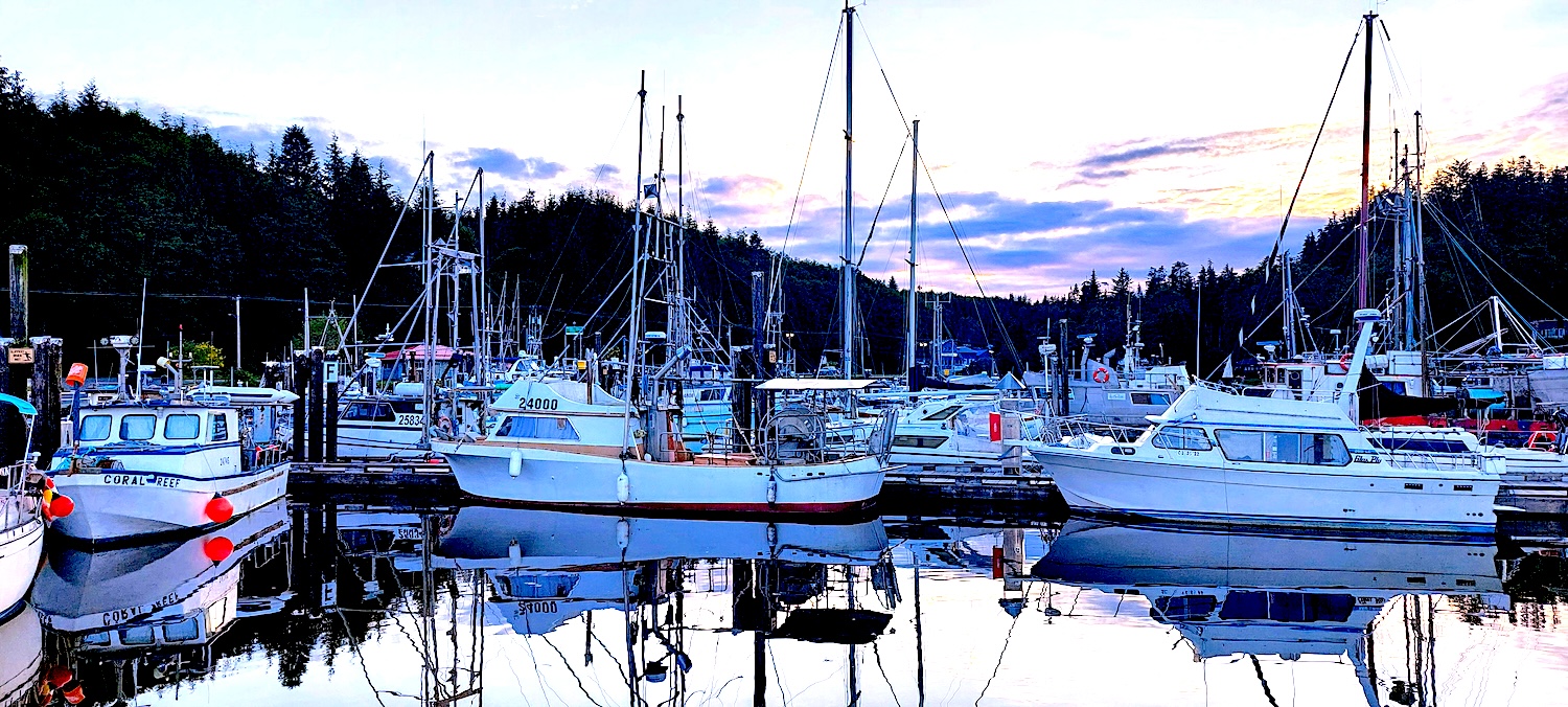 Boats at Fisherman’s Wharf in Port Hardy at about 9 pm