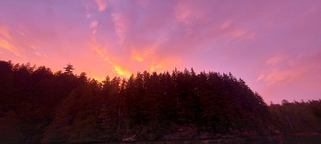Martin had been watching the evening light while working on his laptop in the cockpit, when, at about 9:15 pm, he suddenly exclaimed about what he was seeing, and we all jumped to windows to look out. At first, we noticed the amazing quality of the misty light sweeping the hills at quite a distance across the water, and then I saw that rainbow colors were beginning to rise from the tops of those hills and to arc above them across the water and into the tops of the trees above Braesail’s stern.