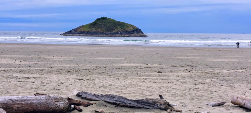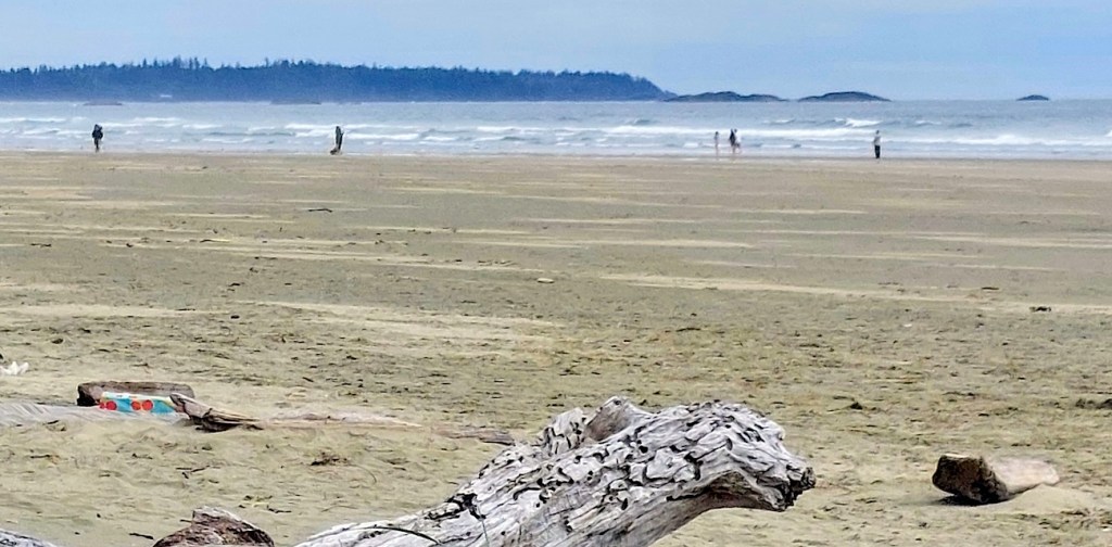 When my feet were beginning to become a bit numb and Karen had chilled sufficiently, we scuffed back through the fine, soft sand to the driftwood where Walt had been sitting, watching the surf and taking some photos. We were just in time to catch the shuttle back around and through Tofino, so we enjoyed some different scenery and got off the bus in the area of town where the very nice Co-Op grocery store provided us with the provisions we’d decided we’d need for the final week of our journey.