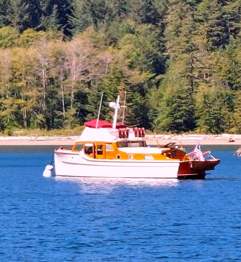 and then turned back toward Ewing Cove on nearby Sucia Island. We were able to sail for a short time past a river of bouncy breakers foaming over an invisible reef, and we waved to furry-sausage sea lions lounging on a pile of rocks. We soon cruised into the cove and found its mooring buoys filled, so we moved around to Sucia Island’s expansive Echo Bay and dropped our anchor there among a great number of boats of all kinds and sizes.