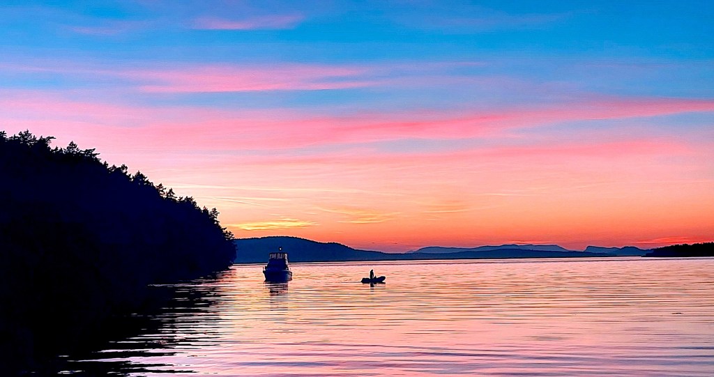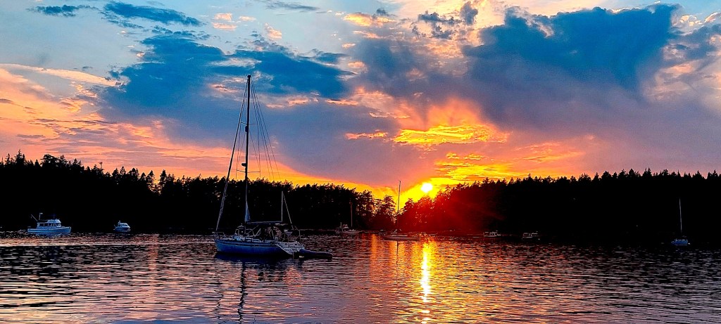 Because Walt’s back pain was occasionally agonizing, we remained at anchor in Echo Bay from Friday afternoon until Monday morning, resting, reading, boat- and sky-watching, and hoping for some improvement. The weather remained very warm and calm, and it was delightful to look out at night at the multicolored anchor-lights at the tops of the surrounding vessels’ masts that bobbed above the bay’s mirror-like surface–were flights of fairies signaling one another with their softly glowing lanterns? On our last night in the bay, were treated to a stunning sunset: