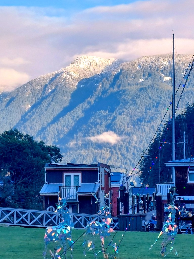 The two-hour trip to the Union Steamship Company Marina in Snug Cove on Bowen Island under brightening skies was quite comfortable despite some rolly swells that we encountered after leaving Vancouver. I spotted a lovely, forked waterfall lacing down into the water at Bowen Island’s side as we were heading into the marina, and spied another small cascade tucked behind some evergreen branches as we entered the marina.
