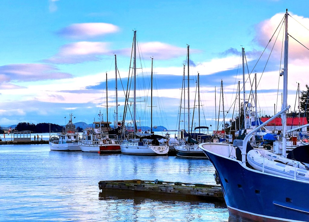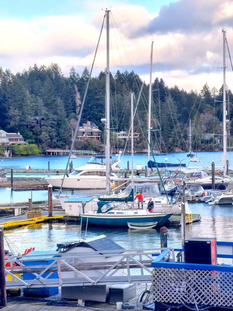 Everyone finally fell back to sleep after the night’s adventures, and by about 11:30 am, we were all in Braesail’s cockpit preparing for our journey from Princess Cove to Ganges Harbour on Saltspring Island. I looked out over the cove at one point and saw a faint, misty rainbow–again I gave thanks for the safe outcome of the night’s “adventure!”