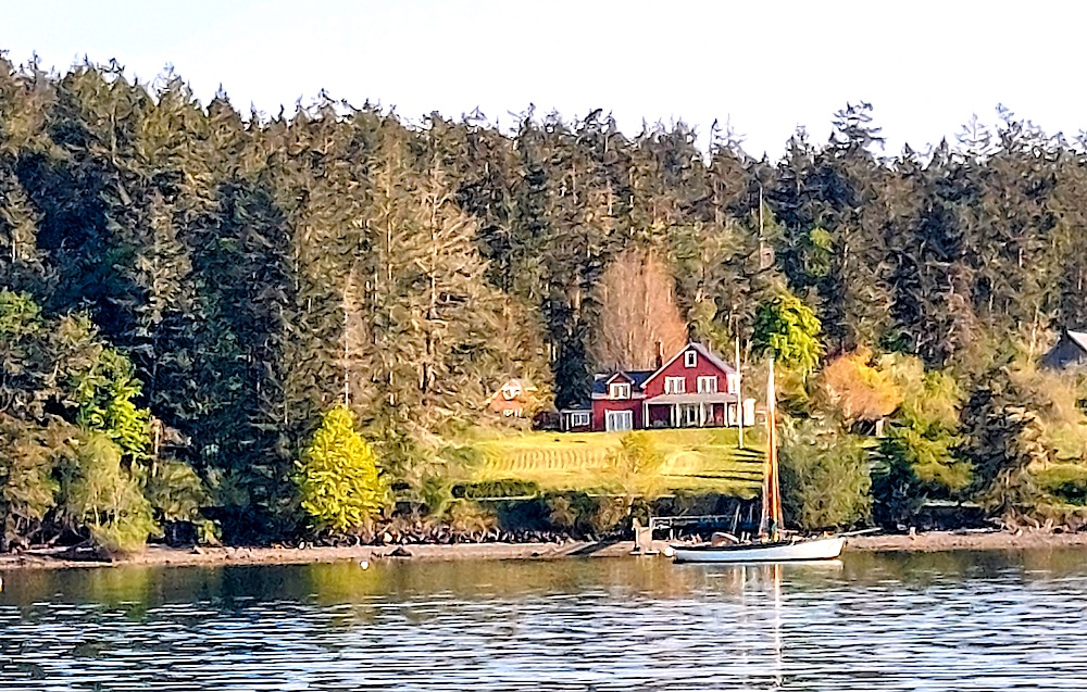 We spent about two hours during the cool, bright afternoon exploring Blind Bay in Coracle, our dinghy, passing beneath the docks at the ferry terminal, traveling close to the surrounding shores, and circumnavigating several small islands.