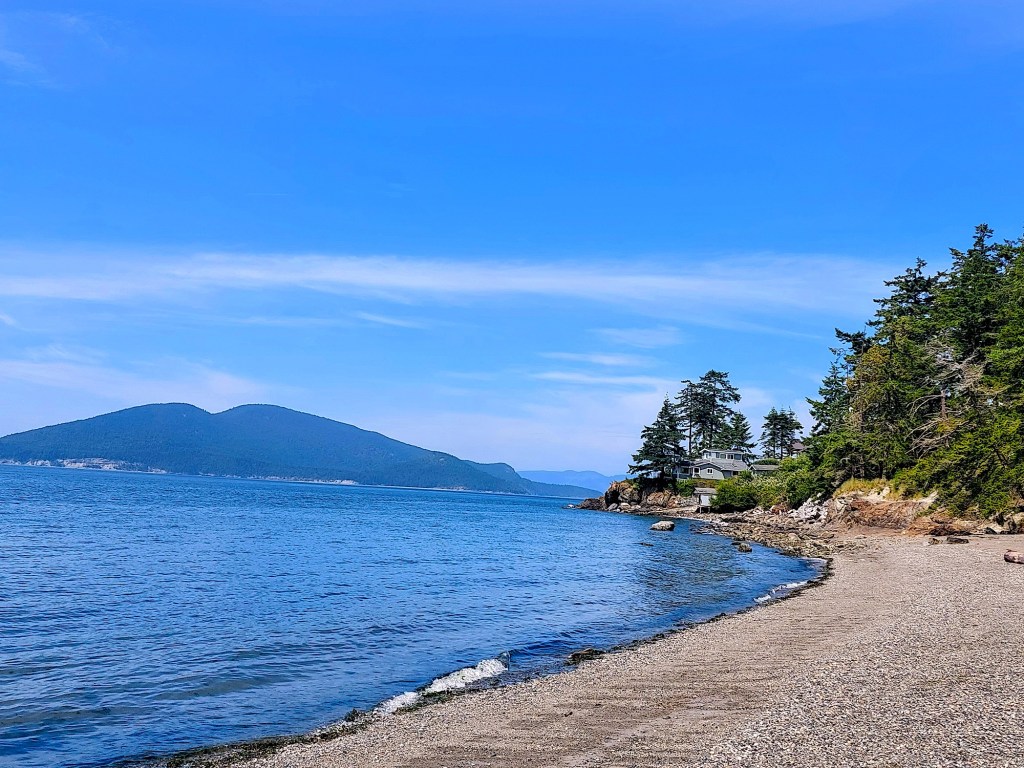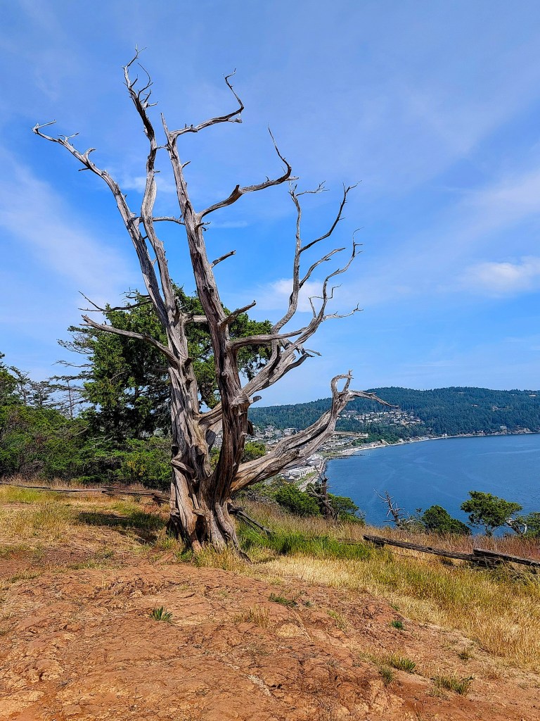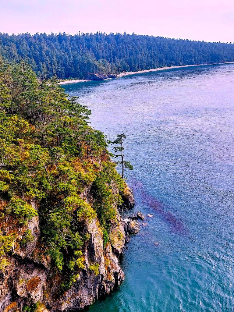 Later, we decided to drive the narrow, twisting loop road through forested Washington Park, and to stop at a lookout point on a tall bluff to enjoy the spectacular views over some wooded islands and the water between them, where currents circled and interlaced and the occasional powerboat zoomed out into the open ocean.