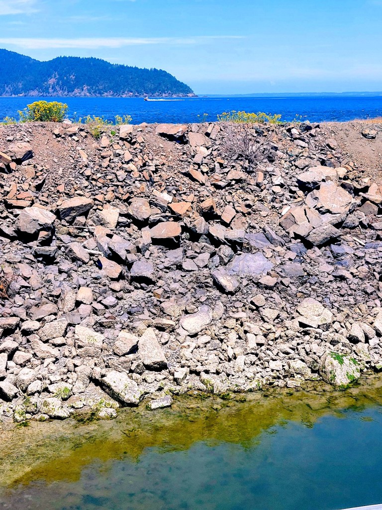 Dan and Walt drove off in search of frozen razor clams to have for dinner (they were successful!), and the rest of us relaxed and chatted at picnic tables visited by shafts of sunlight but also by chilly wind puffs that made our jackets feel quite welcome. Some of us wandered along the curving, rocky beach and stuck our hands and feet into the cold—but not frigid—sea water, and decided that swimming was not a desired activity!