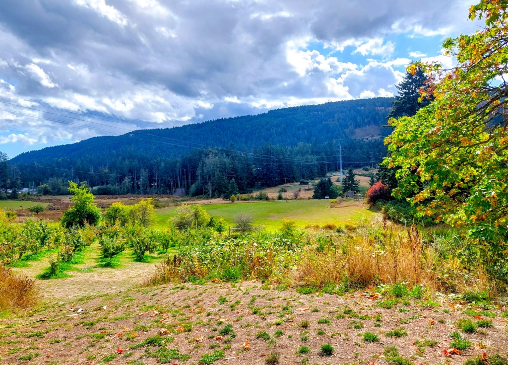 After an excellent worship experience and good conversations with parishioners, Walt and I walked quite a distance on up the hill and then quite steeply down again, past tangles of blackberries and old apple trees bordering pastures and farms, to visit Salt Spring Wild Cider House. We stopped at a large grocery store on the way to snack on sausage rolls and to give my neuropathic feet a rest, and to put some food into our stomachs prior to our anticipated cider tasting. At the cider house and restaurant, we sampled a “flight” of 10 fine craft ciders, all of which were made from the wonderful heritage apples grown on the Saltspring Island, and we bought lunch as well to eat outdoors at a table overlooking an orchard on a gorgeous Autumnal Equinox afternoon!
