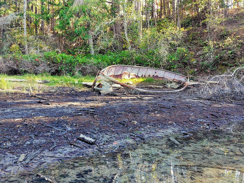 and a disintegrating outhouse with door and walls but little roof, to the also-very-muddy beach at the cove’s southern tip, where Nature was returning to herself a small, abandoned boat.