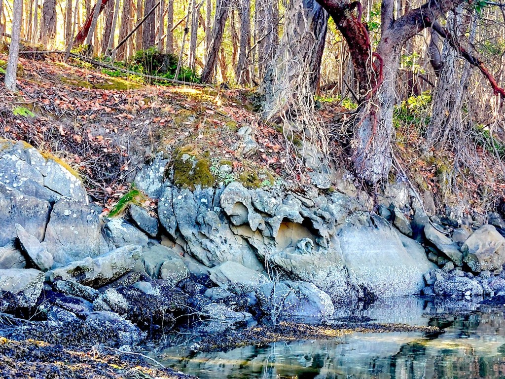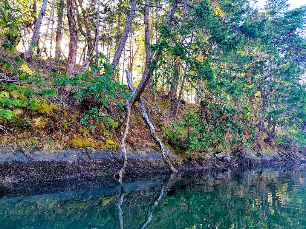 and across its sea-facing mouth, along the southwestern banks where I noticed a “wishbone” tree fallen across another trunk and down a bank
