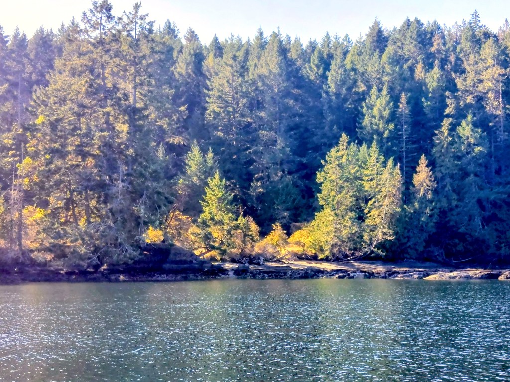High winds were forecast for the coming night, and James Bay was open to the north, the direction from which those winds were to be blowing, and we had heard nothing from the winery on Saturna Island that Walt had contacted about scheduling a tasting. We therefore decided to head for Conover Cove on Wallace Island, an anchorage, protected at its northern end, near which we had stayed in the past (in Princess Cove), but in which we had never spent a night because of its small size and shallowness.