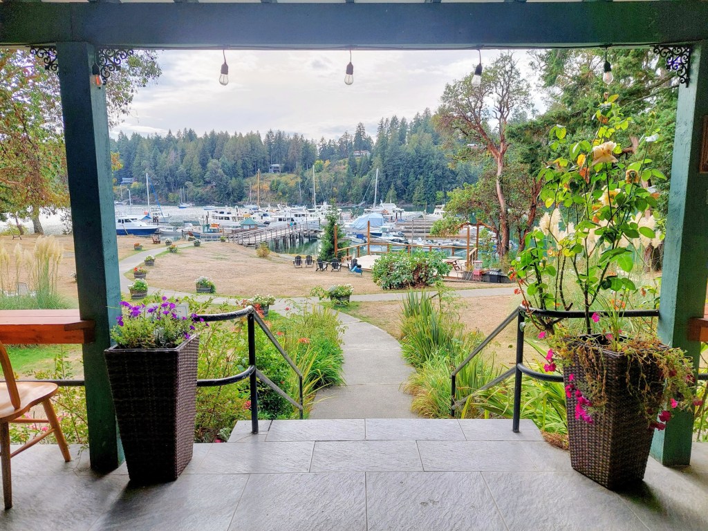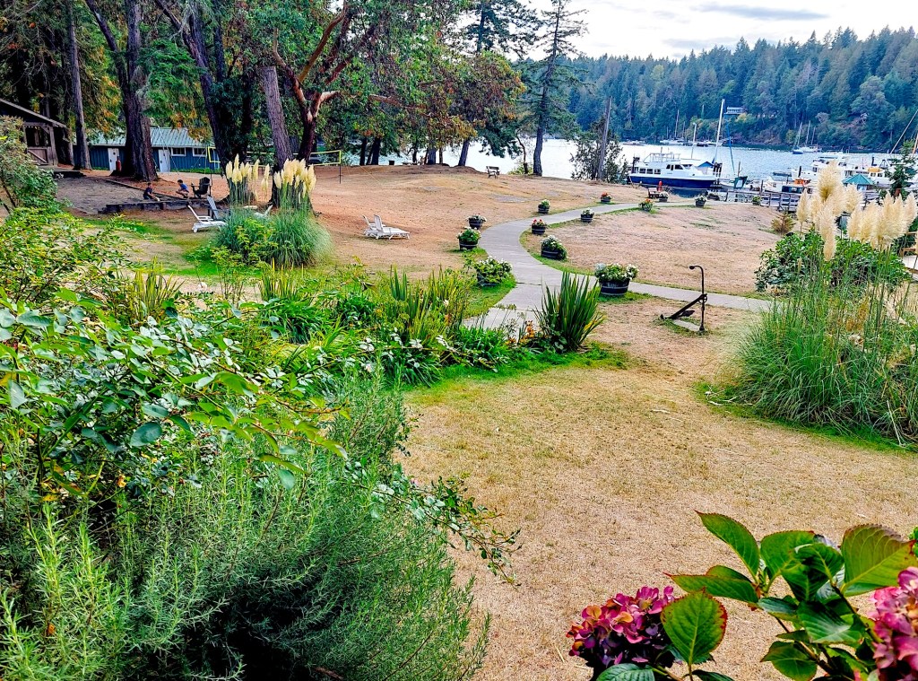 By about noon, we were on our way to Thetis Island, having pulled our stern-line aboard and raised our anchor out of the cove’s shallow water with ease. There was, again, no wind, and so we spent an hour motoring across gently rippling seas and observing the amazingly sculpted sandstone shores of Tent Island. We docked at about 1:30 pm in the very fine Telegraph Harbour Marina (which we’d visited in the spring of 2022 on our way to Alaska) with welcome help from a fellow boater and a young dock-hand.