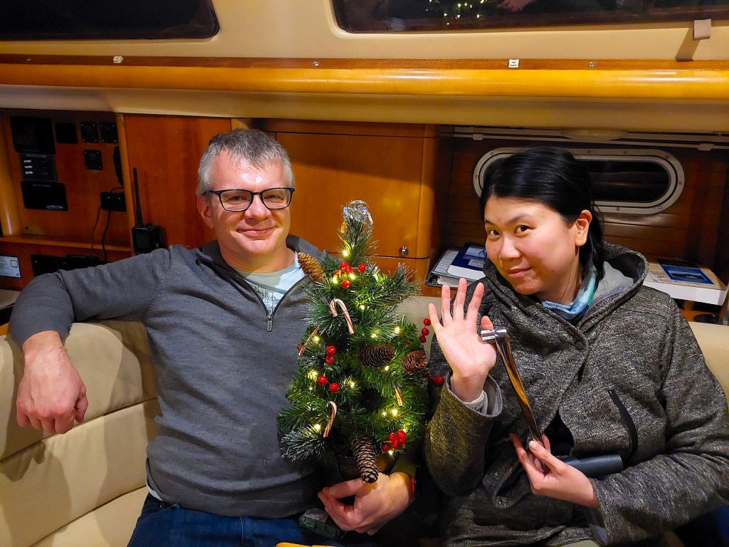 Sometime after about 2 pm, Martin made open-faced cheese sandwiches below decks in the galley and was handing them up to those in the warm, enclosed cockpit when the wind suddenly increased in speed from around 20 kts to 30, the gust grabbed the line attached to the jib (the huge sail at the front of the boat) on the port side of the boat, pulled it off the winch around which it had been wrapped, whipped it into the line on the boat’s starboard side, and proceeded to twist the two lines into a huge knot! The boat had been heeled over to starboard, and now tipped even more sharply, sending various objects, including the small artificial Christmas tree I’d put on the floor in a corner of the main cabin’s settee, and the microwave fastened in a niche above the galley sink, pitching out onto the boat’s floor (no damage was done, but the noise generated by the tumbling microwave was considerable!).