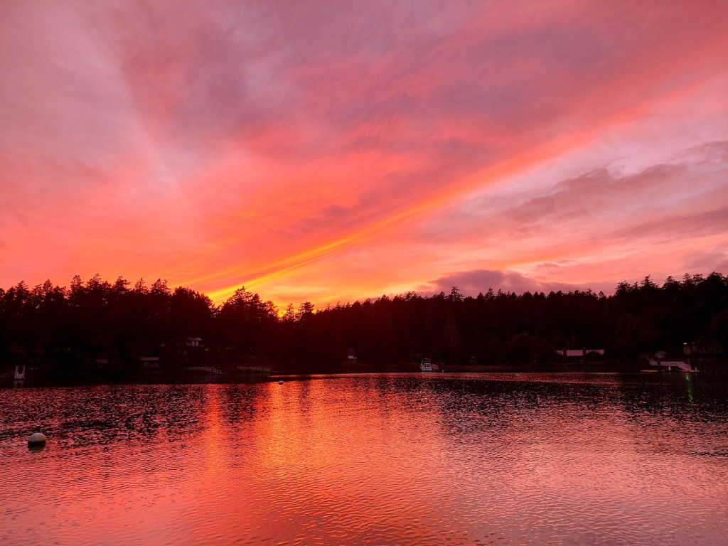 and planned to leave for Cadboro Bay near Victoria, BC, around 8 am on Tuesday in order to arrive at the Royal Victoria Yacht Club docks before noon to pick up the key to the marina gate and onshore facilities before everyone went home for the holiday. A tranquil night awaited us—what sort of weather would we encounter in the morning?