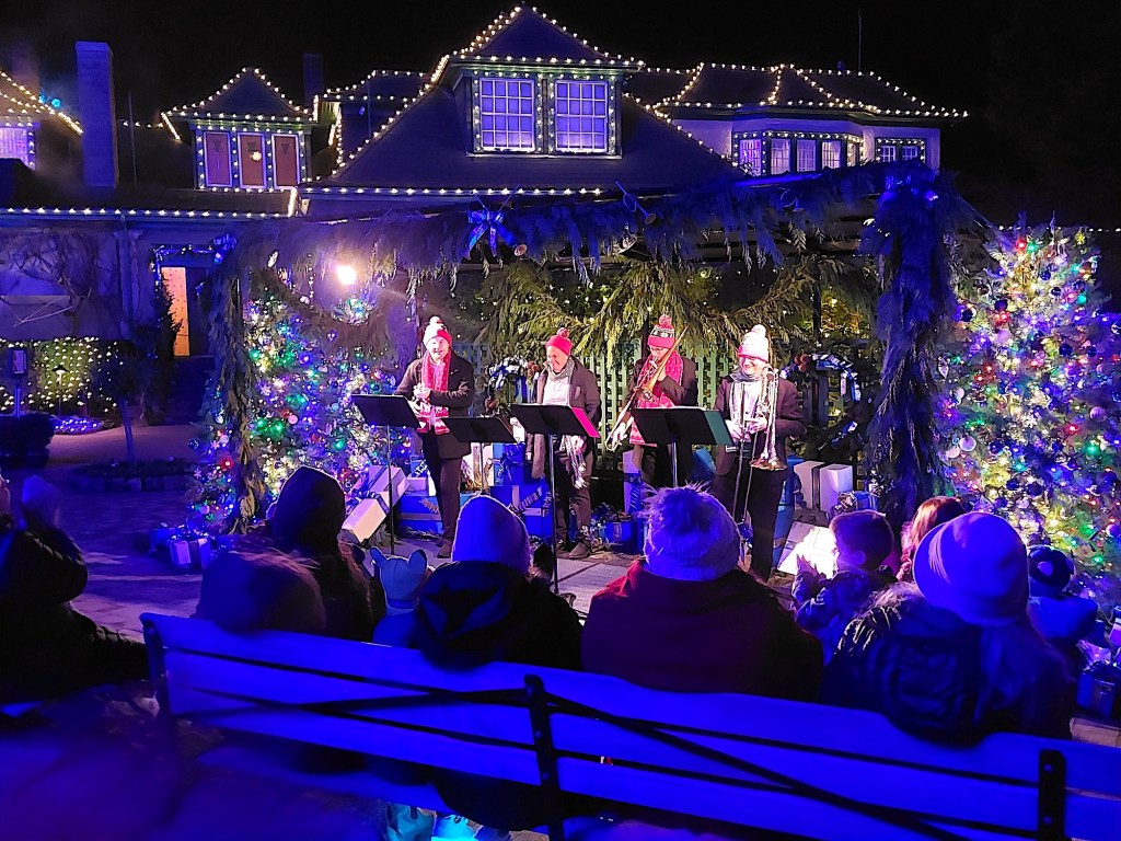 some with lighted trunks and limbs and some decorated with sparkling light-ornaments. In the square in front of the coffee house, information center, gift shop, and restaurant was a shelter decorated with glittering trees and Christmas packages in which alternating half-hour performances by four costumed “Traditional Carolers” and the four-member “Festive Brass” delighted warmly-bundled audiences.