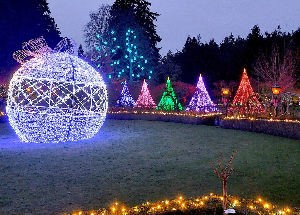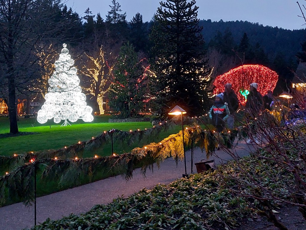 We anchored in the sheltered inlet at about 12:30 pm, caught up on some reading, checked to make sure that our dinghy light was functional, put on layers of warm clothes, and climbed into Coracle at 2:30 to row the short distance to the “nature float” near the shore. Having secured the dinghy to the dock, we walked across the sandy beach and then along an easy dirt road through the forest for about 10 minutes to one of the parking areas at the world-renowned 55-acre Butchart Gardens (visit https://butchartgardens.com/ to read about the gardens and see many great pictures) created 121 years ago from an exhausted limestone quarry. We spent about two-and-a-half hours strolling around the gorgeous display gardens as the sun set (at about 4:30 pm), a misty half-moon rose, and the phenomenal lights came into view. Among the beauties of the gardens in their festive “Magic of Christmas” garb were: whimsical depictions of the Twelve Days of Christmas scattered throughout the gardens (the “Four Calling Birds” were shown using cellphones and the “Three French Hens” were enjoyed croissants near a small lighted Eiffel Tower!); an ice skating rink; a train layout running through a miniature winter village;