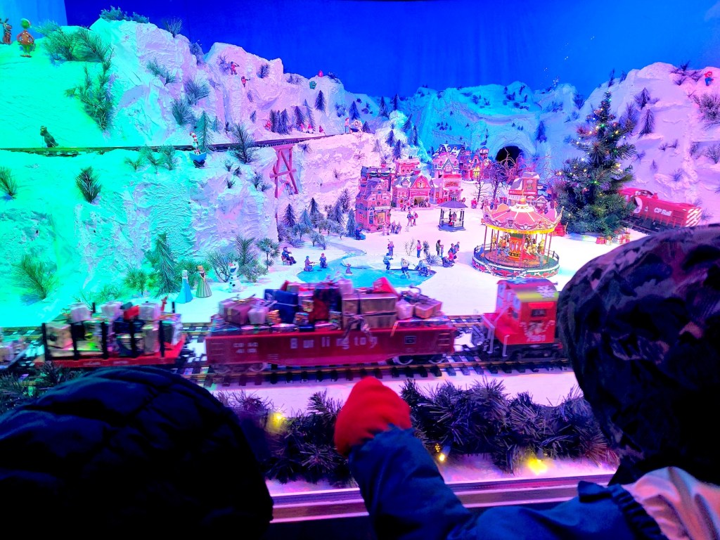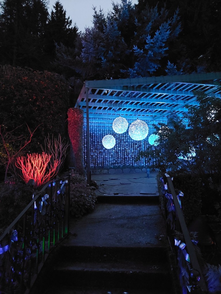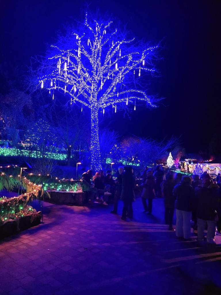 an indoor cascade of various poinsettias and orchids; the Rose Carousel (whose parading animals included a reindeer with a glowing red nose); two recently-carved Coast Salish totem poles; illuminated fountains and trees of all sorts (the lights in one of them moved along the branches and changed color when a viewer clapped or sang or otherwise made noise), softly glowing globes about the size of soccer balls, scattered about the bases of redwood trees, that faded from one pastel color into another; a waterfall, pool, and stream composed of moving blue lights; vast beds of “light-flowers” at the bottom of the Sunken Garden; light “fire-flies” in the trees above one’s head; and “Christmas trees” of all kinds,