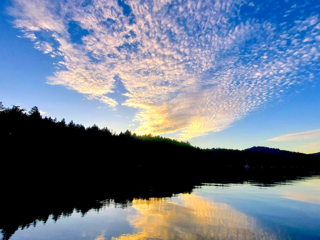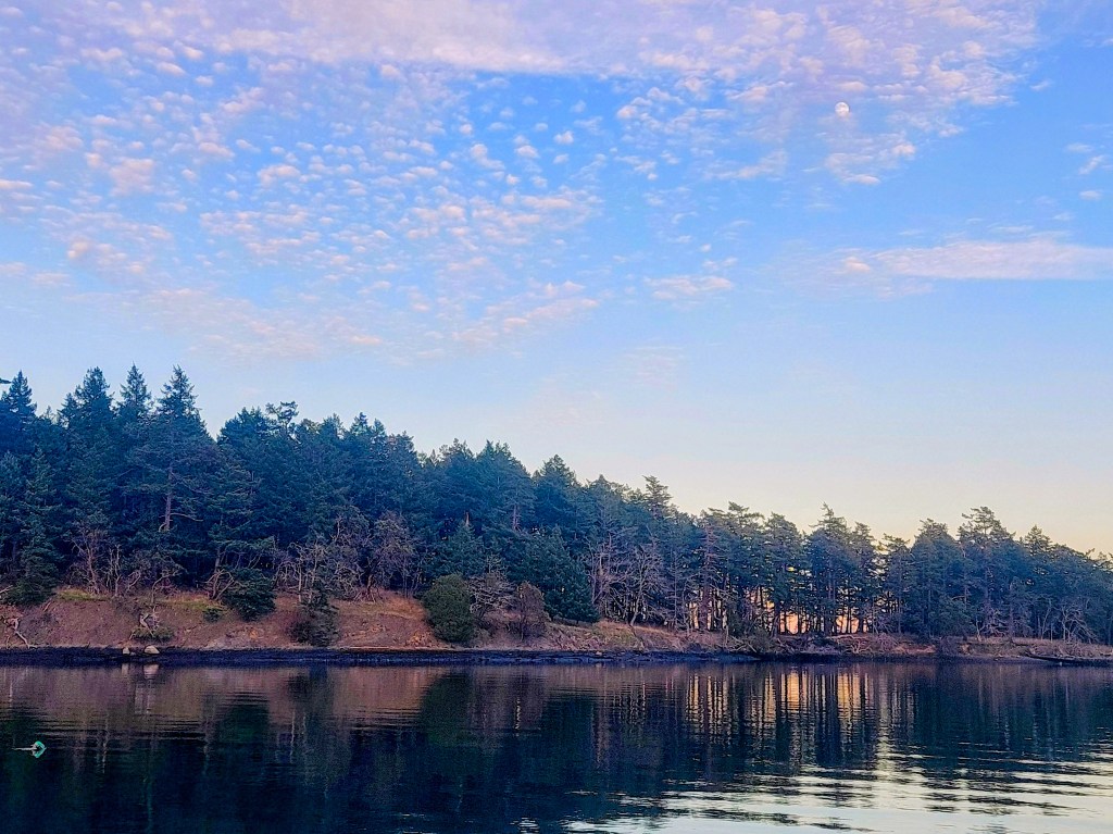 After a more “exciting” day than we’d anticipated, we shared chips and dip in the main cabin on a beautifully sunny late-afternoon, I did some line-neatening, window-cleaning, and picture-taking around the boat’s exterior as a waxing gibbous moon rose in the southeast and a fan of gilded cloud puffs spread out to the southwest,